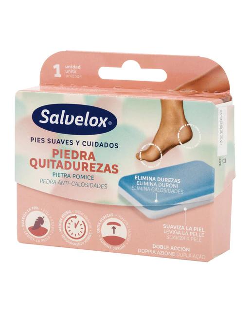 La piedra quitadurezas Salvelox está compuesta 100% de vidrio celular, lo que permite eliminar las durezas y suavizar la piel envejecida. Es un producto no irritante, bacteriostático, débil sensibilizante y carente de ecotoxicidad.